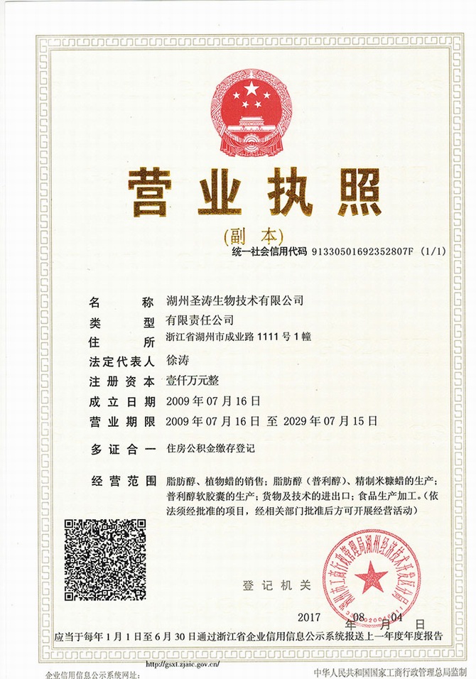 食品生產(chǎn)許可證(米糠脂肪烷醇)